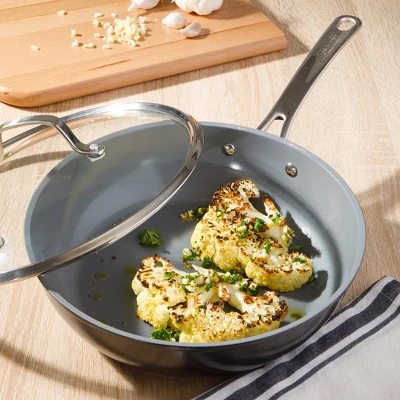 The ceramic nonstick interior proves that healthier cooking doesn’t have to be boring. Made without PFOA, PTFE, lead, or cadmium, the nonstick surface features an easy-release design that prevents food from sticking—without the need for added oil or fat. Stainless steel handles feature a Y-shaped design to help dissipate heat and stay cool to the touch. Each pot comes with a tempered glass lid to retain heat and moisture while allowing visibility to monitor food as it cooks. Induction-compatible and oven-safe up to 500°F (350°F with glass lids). Hand wash recommended.