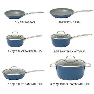 - WHAT’S IN THE BOX: two frying pans (8 inches and 10 inches), two saucepans with lids (1.4 quarts and 2 quarts), one 3.3-quart sauté pan with lid and one 4.85-quart dutch oven with lid