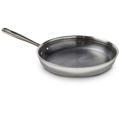 T-fal HybridMesh cookware combines innovation and performance. The heavy-duty tri-ply construction ensures long-lasting durability and even heat distribution across all cooktops, including induction. The cast riveted handles provide a secure, comfortable grip. The cooking surface features a unique stainless steel pattern that’s perfect for searing and is metal utensil safe, so you can cook with confidence and convenience. This cookware is also dishwasher safe and oven safe up to 500°F. Elevate your kitchen with our 12 inch frypan.