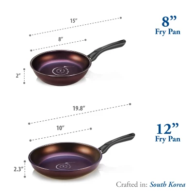 The Art Collection Nonstick Frying Pan is designed for both performance and convenience, featuring forged heavy-gauge aluminum construction for even heat distribution and prevention of hot spots. Its standout feature is the innovative print design technology on the bottom, which helps guide you to pour the perfect amount of oil, ensuring healthier cooking with every meal. The 5-layer reinforced nonstick coating, enhanced with scratch-resistant, PFOA-free Teflon, guarantees durability and long-lasting performance. With extra-tall, sloped sidewalls for a larger cooking surface and effortless food tossing, the pan’s rivet-free interior prevents food buildup for easier cleaning. The induction-ready heavy-duty forged base ensures stability on all stovetops, including induction, while the heat-resistant soft-touch handle offers a comfortable, secure grip. Oven safe up to 350°F and dishwasher safe, this versatile pan is perfect for frying, stir-frying, grilling, and more. Made in Korea, it delivers exceptional quality for all your cooking needs.