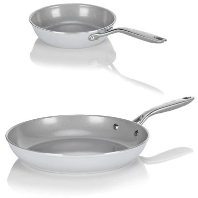 The CeraTerra Collection Frying Pan combines premium performance with exceptional durability, making it a versatile kitchen essential. Its forged heavy-gauge aluminum construction ensures even heat distribution, preventing hot spots for consistent cooking results. Featuring a non-toxic Ceramica ceramic coating, free from PFOA, PTFE, PFAS, Cadmium, and Lead, this pan delivers a healthier, nonstick cooking experience with effortless food release and easy cleanup. The extra-tall, sloped sidewalls provide a larger cooking surface and make tossing food simple, while the heavy-duty forged base is compatible with all cooktops, including induction, and resists warping. A double-riveted stainless steel handle stays cool during stovetop use for added comfort and strength. Oven-safe up to 450°F and dishwasher-safe, the CeraTerra Frying Pan is perfect for a variety of cooking methods, from frying and grilling to baking, making it an essential tool in any kitchen.