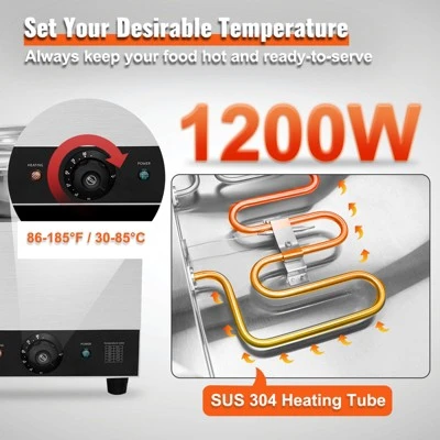 Fast Heating, Lasting Warmth: This impressive food warmer comes with a powerful 1200-watt stainless steel heating tube that rapidly warms up your food to maintain its hot and delicious flavors. You can adjust the temperature output to suit your preference, ranging from 86 – 185℉ / 30 – 85℃, thanks to the temperature controller.