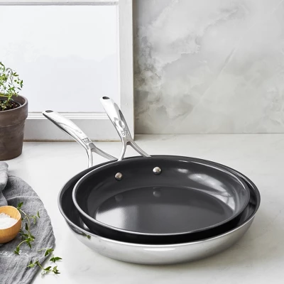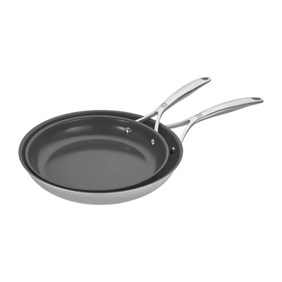 Upgrade your kitchen with ZWILLING Energy Plus cookware. Sear steaks and sauté vegetables in the 10-inch fry pan. Shallow-fry cutlets, or cook a crispy potato hash for the whole family in the roomy 12-inch fry pan.Enjoy the high performance of the revolutionary Ceraforce XTREME ceramic nonstick coating. It’s 50% longer lasting and 3x more durable than our previous nonstick. The multi-layer nonstick coating offers effortless release and quick clean up, and the sturdy, clad construction with aluminum core heats up evenly and quickly.Comfortable, v-shaped, stay-cool handles ensure maximum maneuverability, and the flared rims offer clean, seamless pouring. Energy Plus is compatible with all stovetops, including induction, and is oven safe to 400°F. Dishwasher safe, Energy Plus is also simple to clean, making this easy-to-use cookware a pleasure to cook with.
